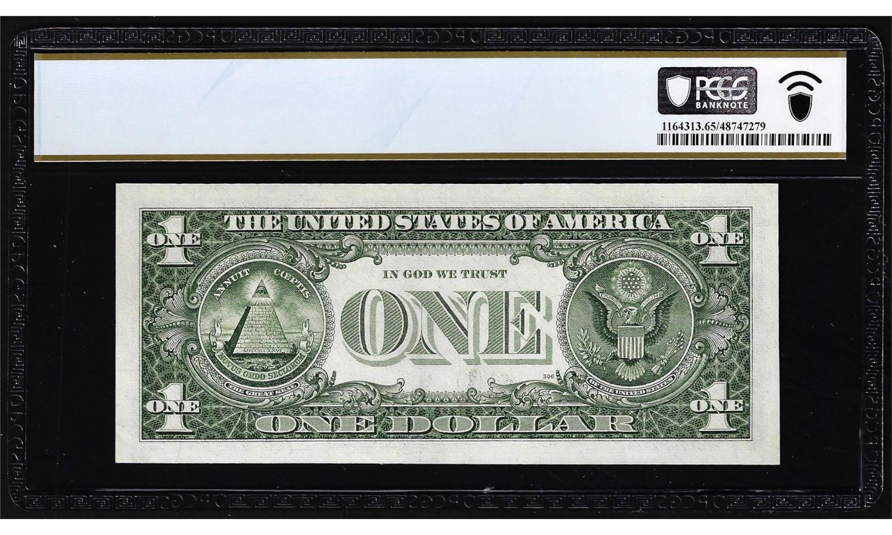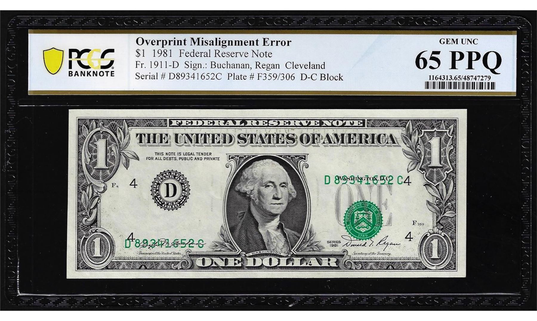 One 1981 $1 Federal Reserve Note Cleveland Misaligned Overprint Error PCGS Gem Unc 65PPQ. PCGS Graded.