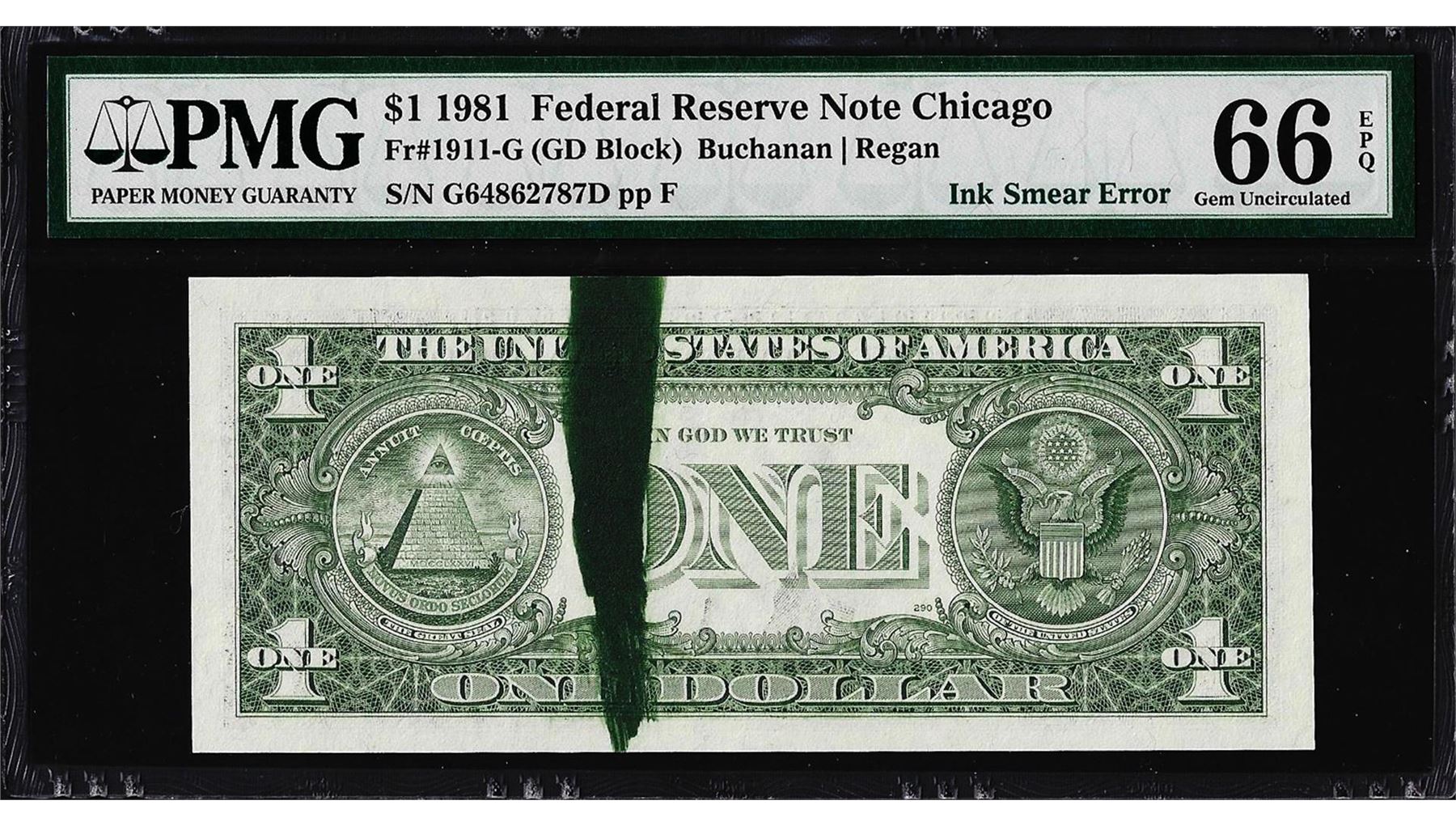 One 1981 $1 Federal Reserve Note Ink Smear ERROR PMG Gem Uncirculated 66EPQ. PMG Certified.