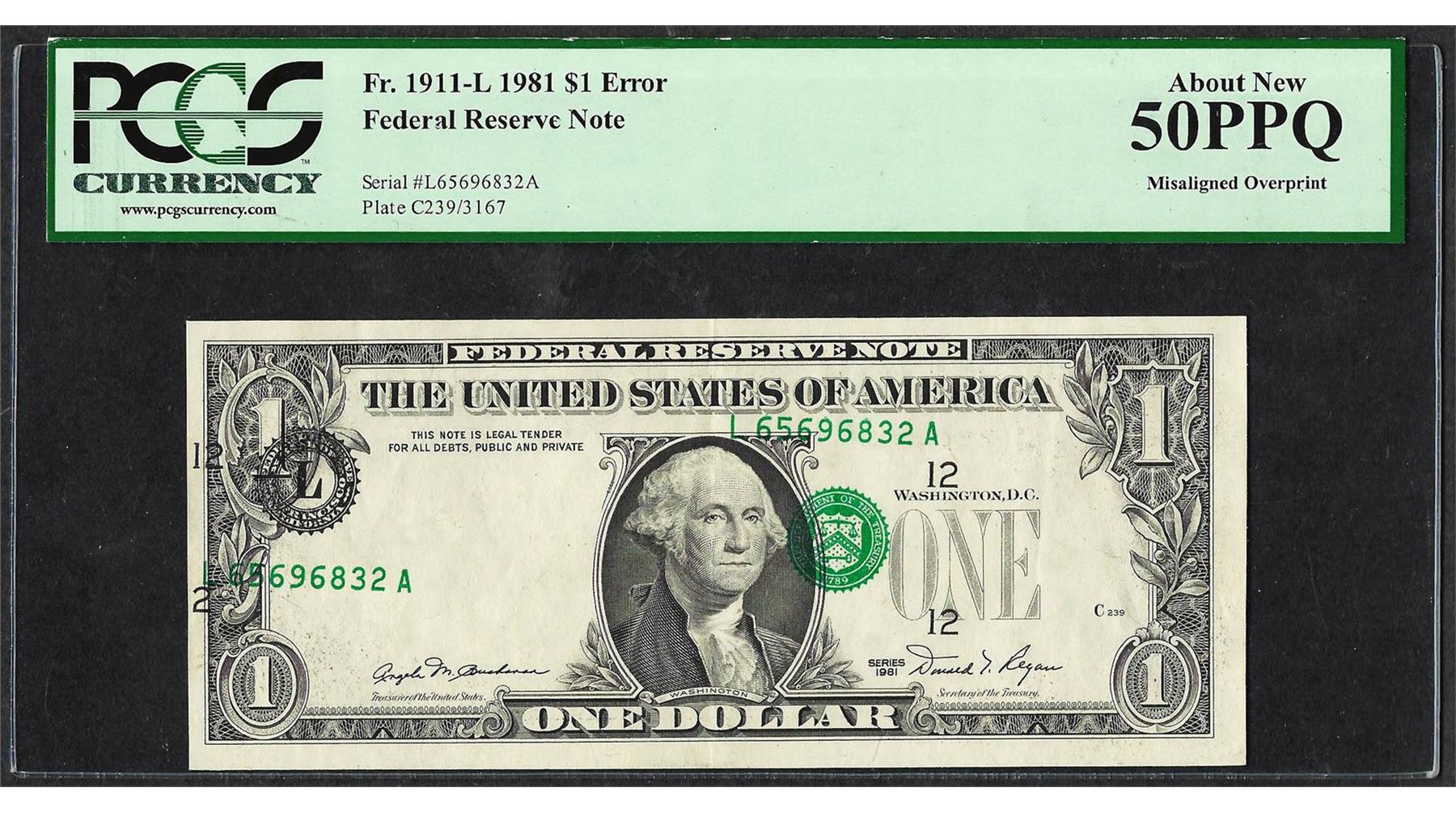 One 1981 $1 Federal Reserve Note Misaligned Overprint ERROR PCGS About New 50PPQ. PCGS Graded.