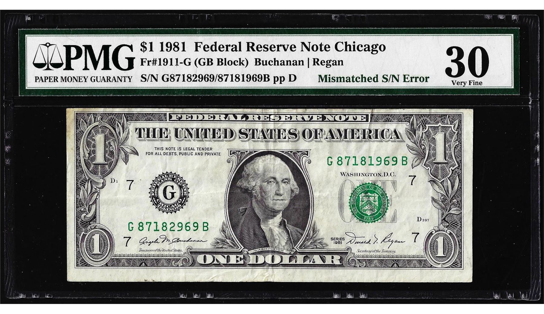 One 1981 $1 Federal Reserve Note Mismatched Serial Number Error Fr.1911-G PMG Very Fine 30. PMG Certified.