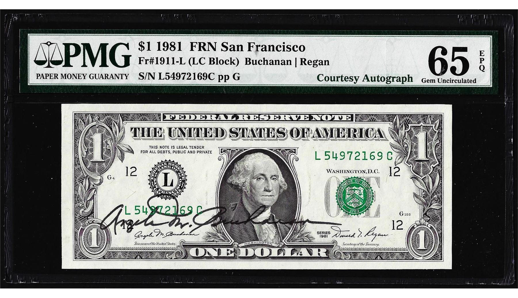 1981 $1 Federal Reserve Note PMG Gem Uncirculated 65EPQ Courtesy Autograph