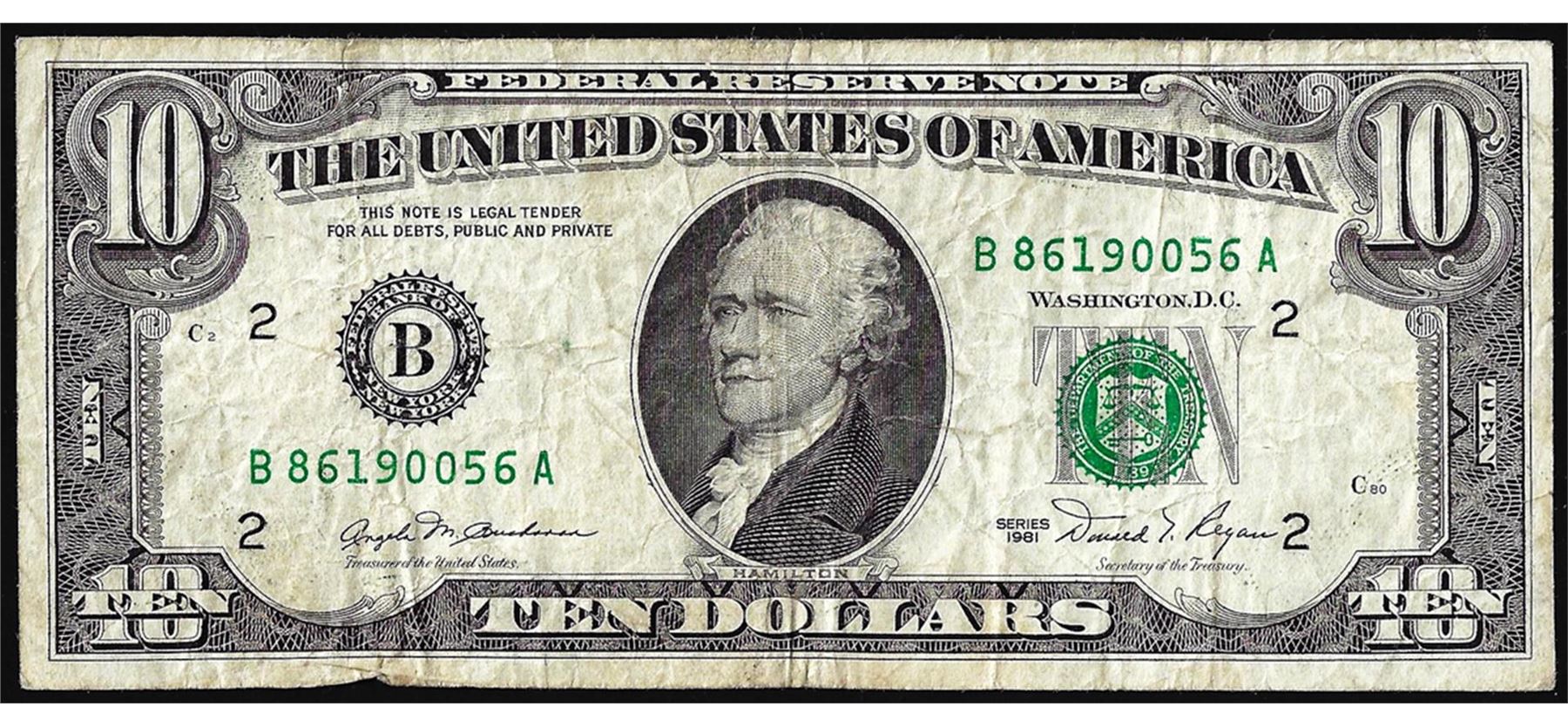 One 1981 $10 Federal Reserve Note New York Ink Smear ERROR.