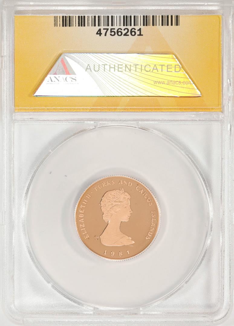 One 1981 100 Crowns Proof Turks & Caicos Royal Wedding Gold Coin ANACS PF69DCAM. ANACS Certified.