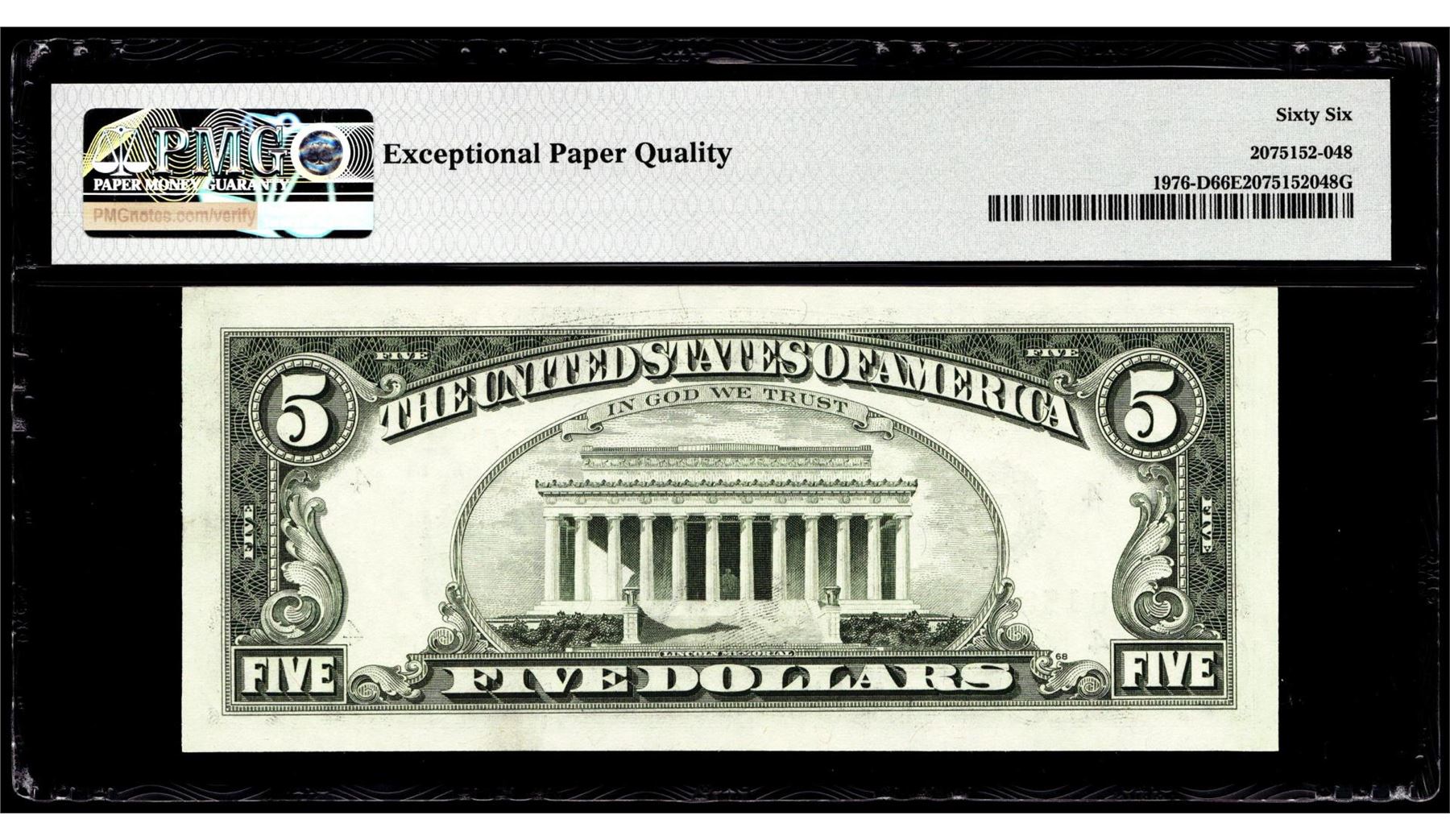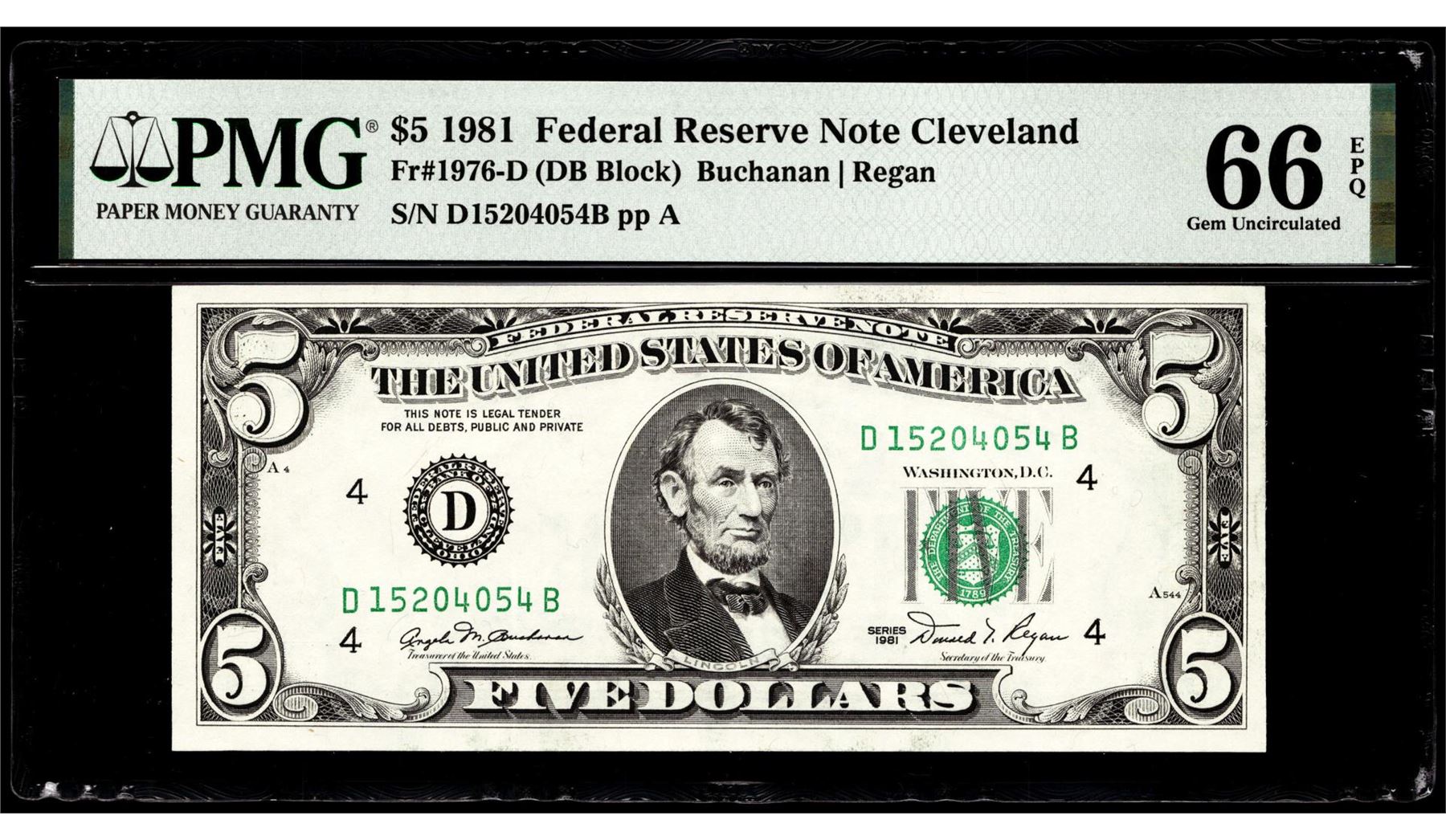 One 1981 $5 Federal Reserve Note Cleveland Fr.1976-D PMG Gem Uncirculated 66EPQ. PMG Certified.