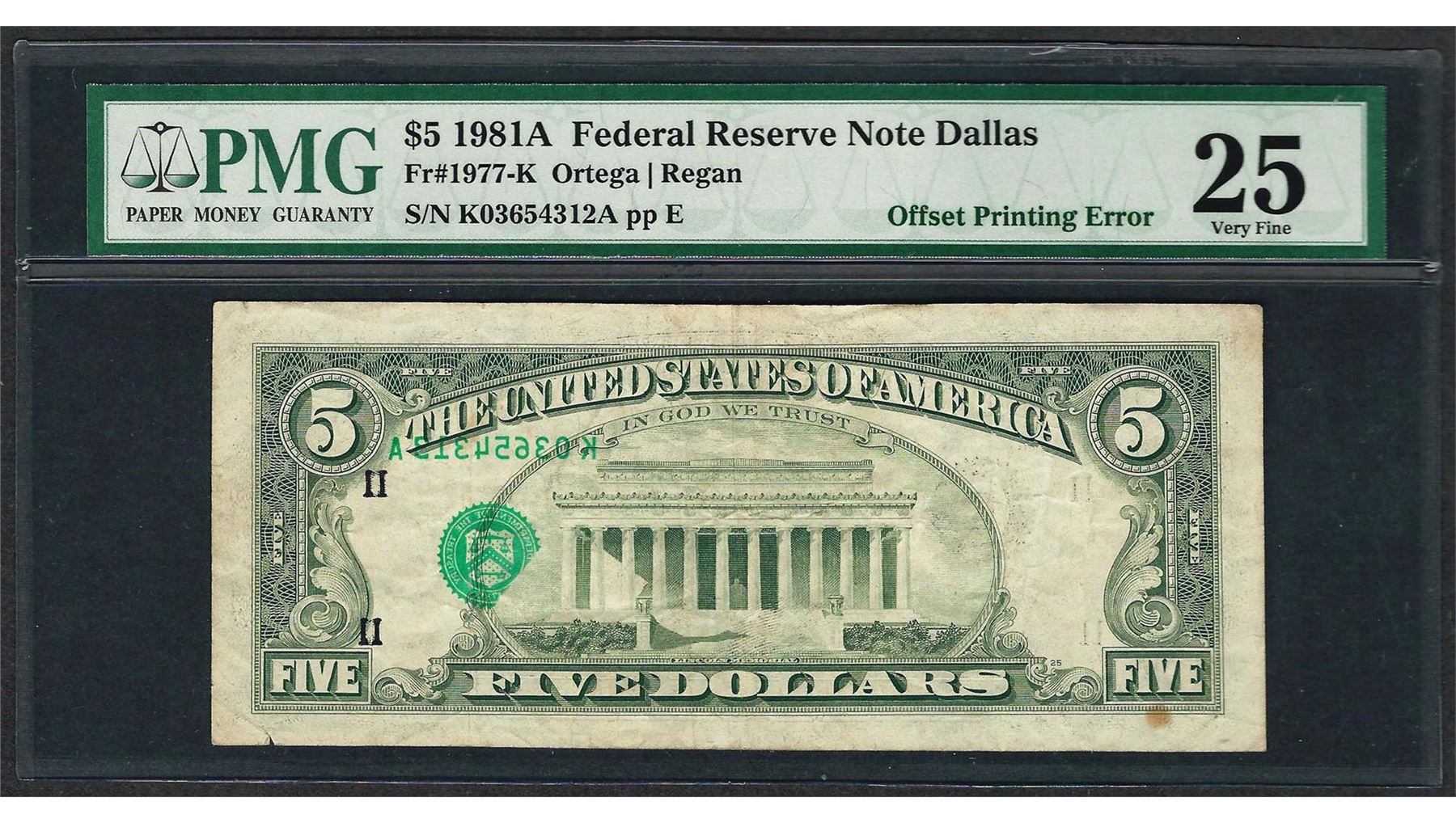 1981 $5 Federal Reserve Note ERROR Offset Printing PMG Very Fine 25