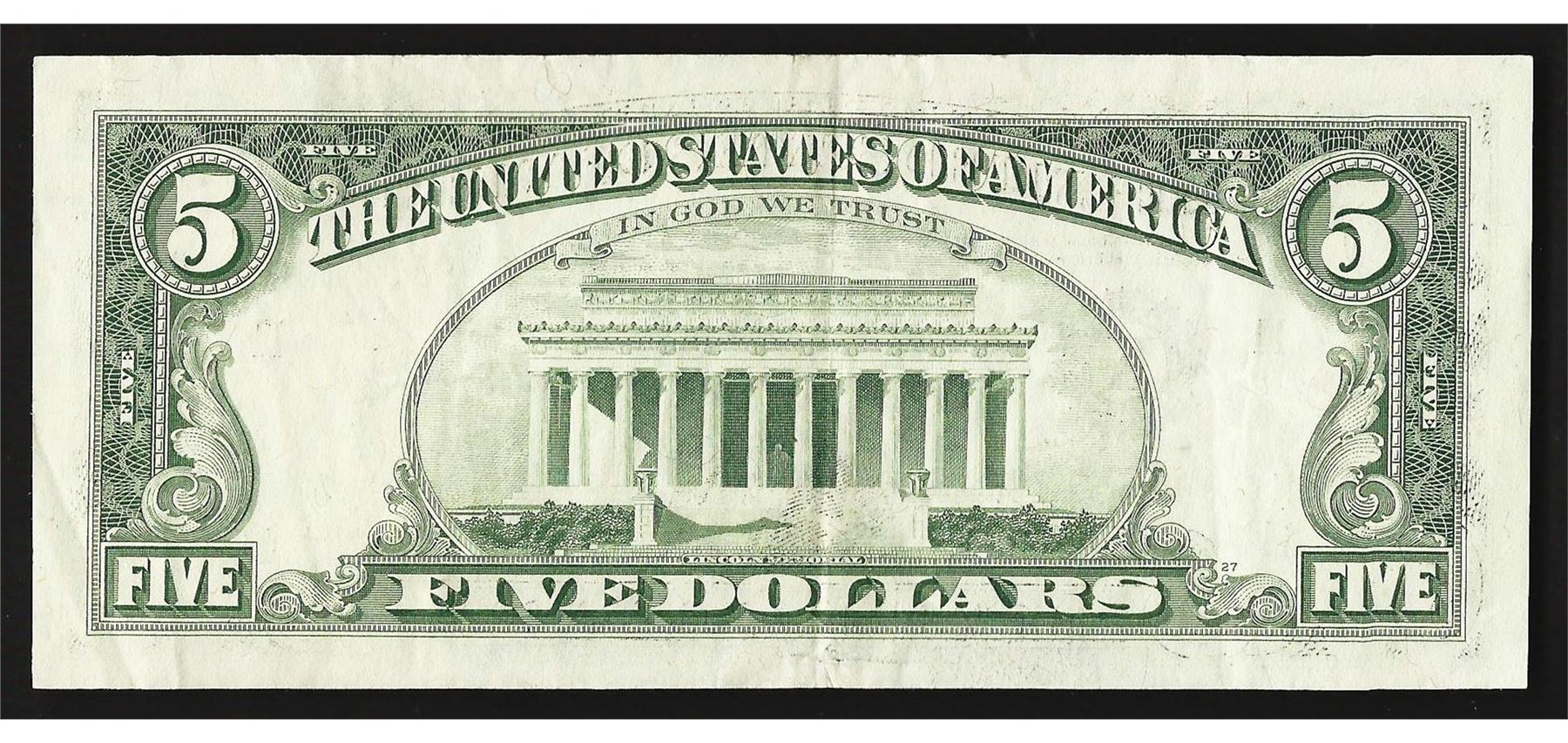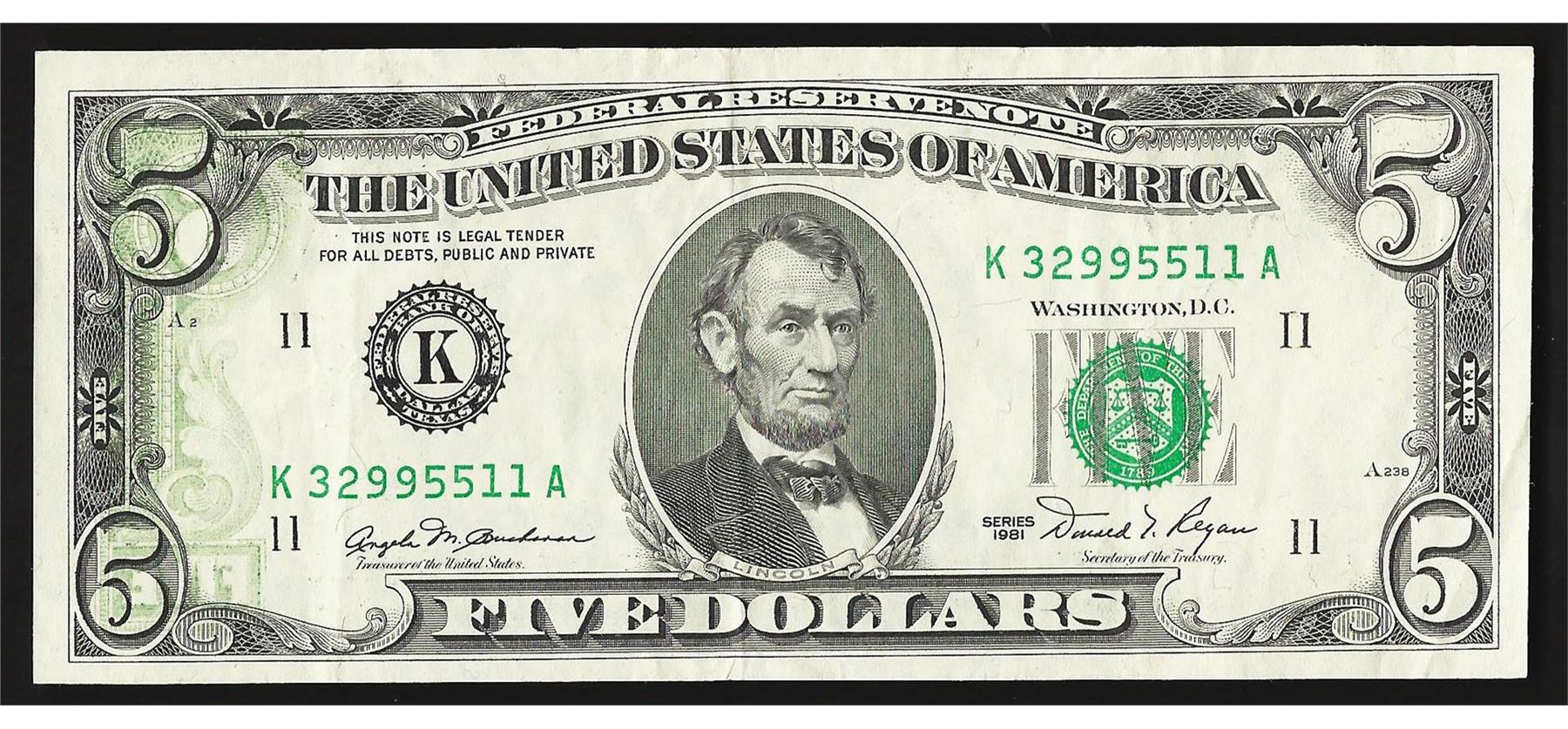 One 1981 $5 Federal Reserve Note ERROR Partial Offset.