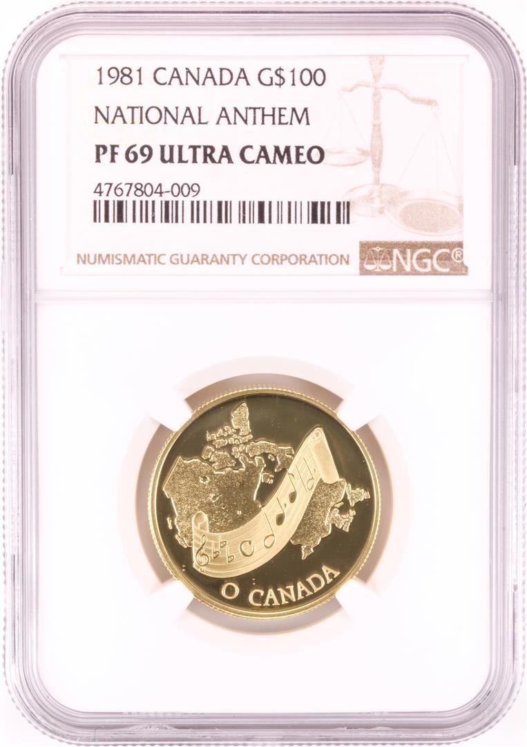 One 1981 Proof Canada $100 National Anthem 1/2 oz Gold Coin NGC PF 69 Ultra Cameo. NGC Certified.
