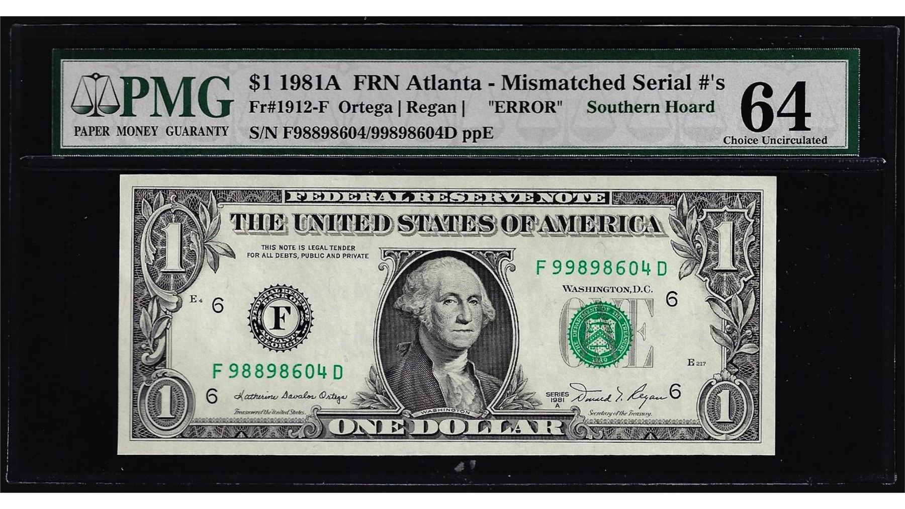 One 1981A $1 Federal Reserve Note Atlanta Mismatched S/N Error PMG Choice Uncirculated 63. PMG Certified.