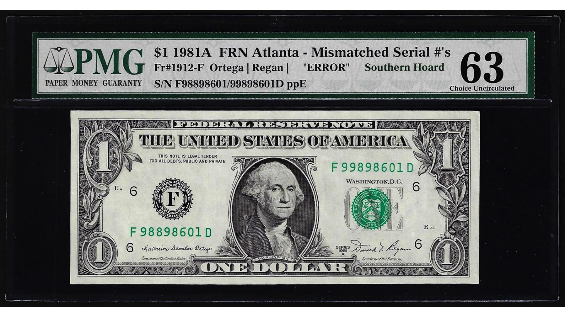 One 1981A $1 Federal Reserve Note Atlanta Mismatched S/N Error PMG Choice Uncirculated 63. PMG Certified.