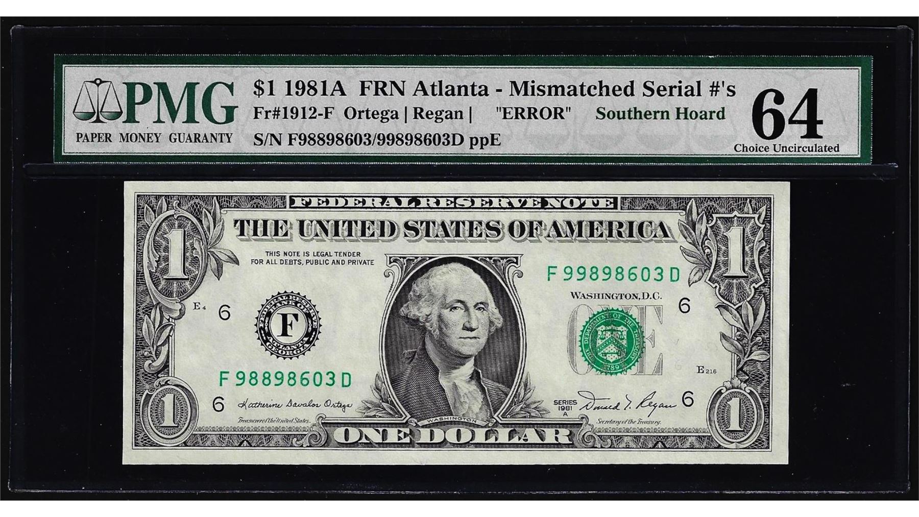 One 1981A $1 Federal Reserve Note Atlanta Mismatched S/N Error PMG Choice Uncirculated 64. PMG Certified.