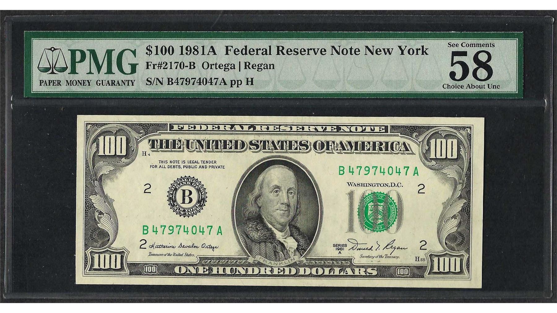One 1981A $100 Federal Reserve Note New York Fr.2170-B PMG Choice About Uncirculated 58EPQ. PMG Certified.