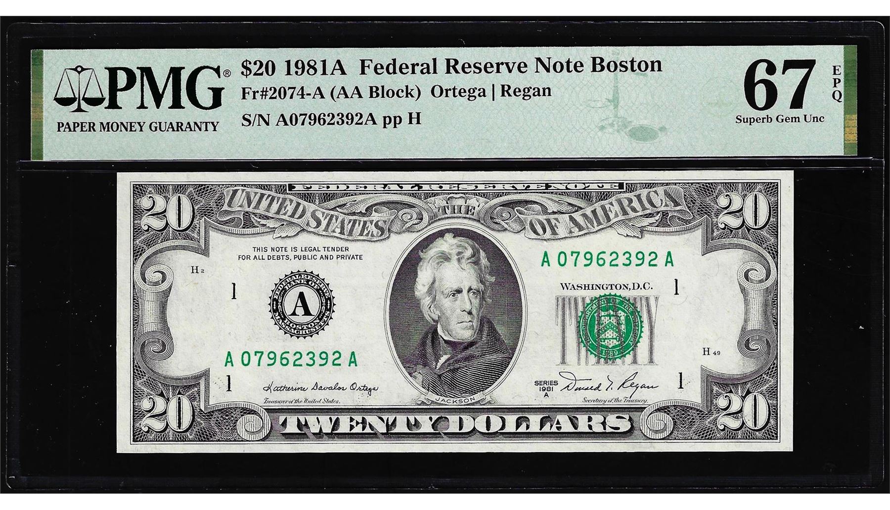 1981A $20 Federal Reserve Note Boston Fr.2074-A PMG Superb Gem Uncirculated 67EPQ