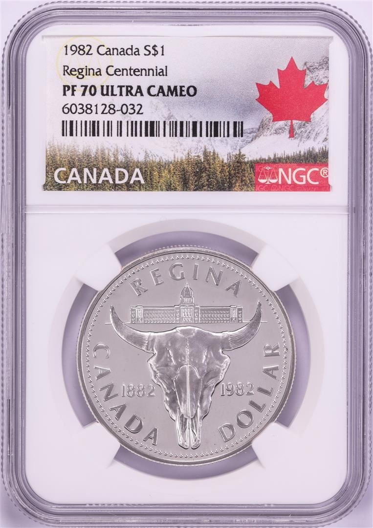 One 1982 $1 Proof Canada Regina Centennial Silver Dollar Coin NGC PF70 Ultra Cameo. NGC Certified.
