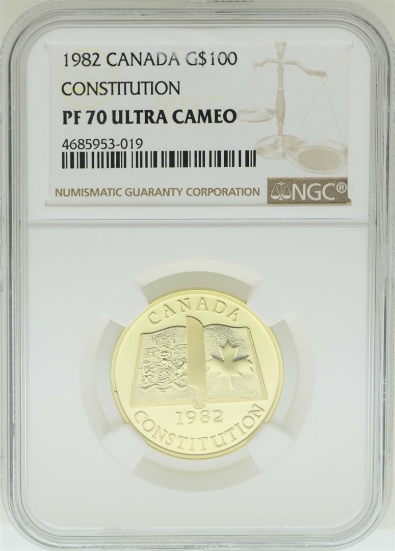 One 1982 $100 Canada Constitution Gold Coin NGC PF70 Ultra Cameo. NGC Certified.