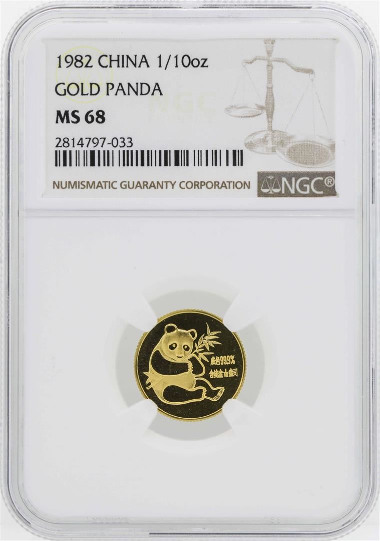 One 1982 China 1/10 Oz. Gold Panda Coin NGC MS68. NGC Certified.