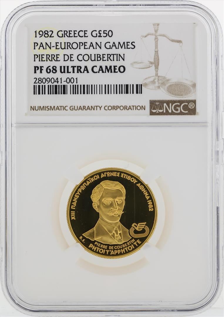 One 1982 Greece 50 Pounds Pan-European Games Gold Coin NGC PF68 Ultra Cameo. NGC Certified.
