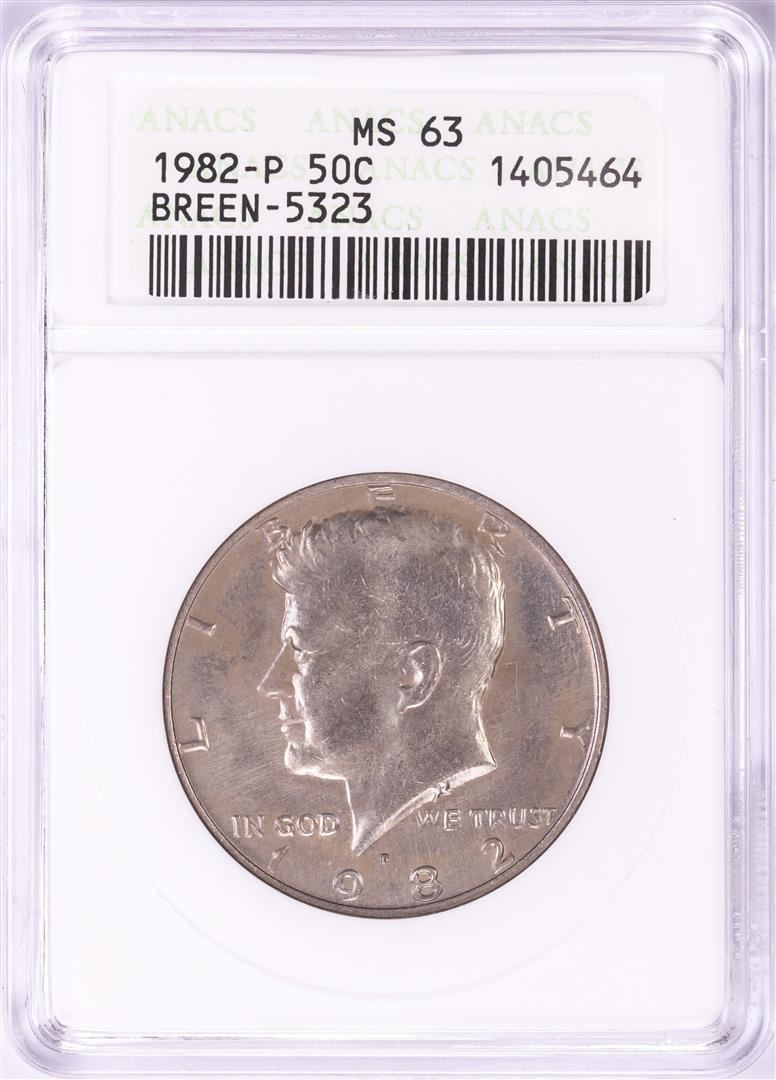 One 1982-P Kennedy Half Dollar ANACS MS63 Breen-5323. ANACS Certified.