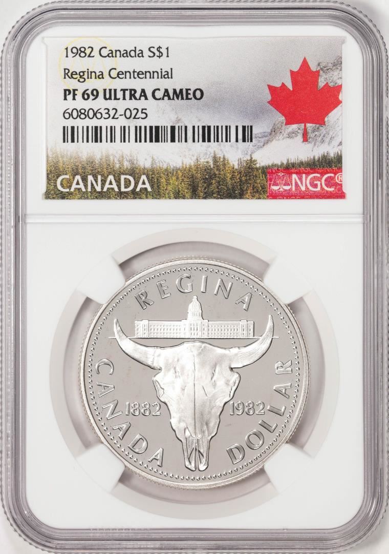 One 1982 Proof Canada $1 Regina Centennial Silver Dollar Coin NGC PF69 Ultra Cameo. NGC Certified.