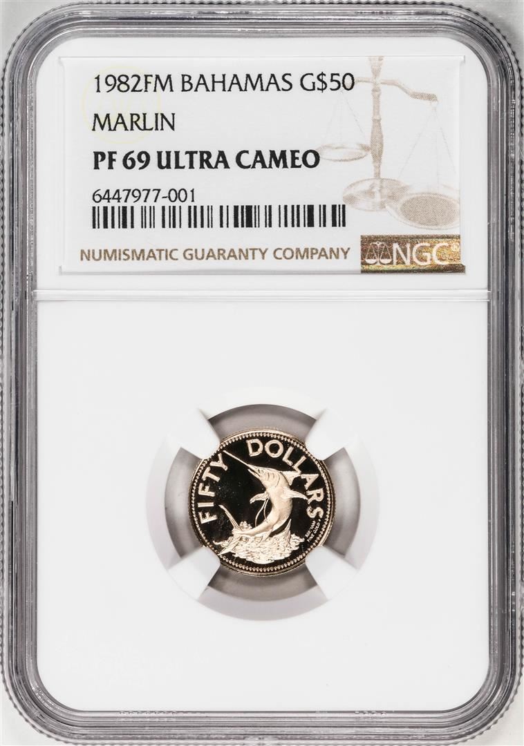 One 1982FM $50 Bahamas Marlin Proof Gold Coin NGC PF69 Ultra Cameo. NGC Certified.