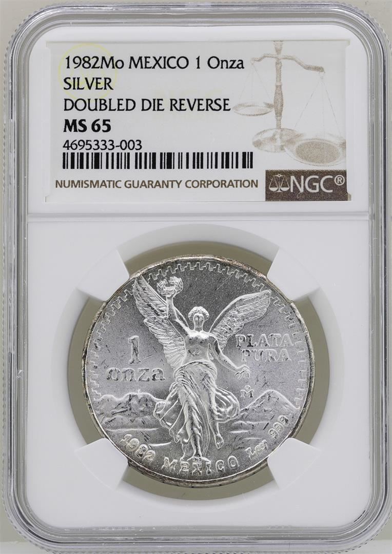 One 1982Mo Mexico Libertad Onza Doubled Die Reverse Silver Coin NGC MS65. NGC Certified.