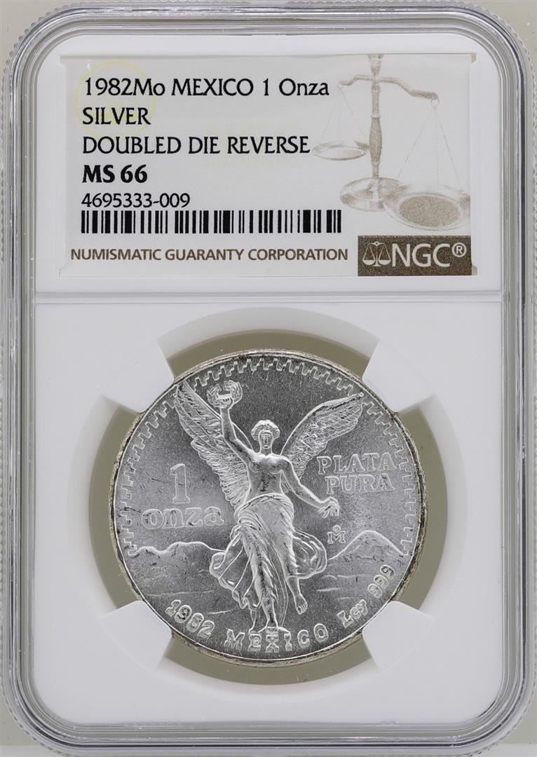One 1982Mo Mexico Libertad Onza Doubled Die Reverse Silver Coin NGC MS66. NGC Certified.