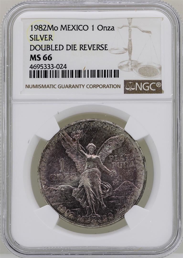 One 1982Mo Mexico Libertad Onza Doubled Die Reverse Silver Coin NGC MS66. NGC Certified.