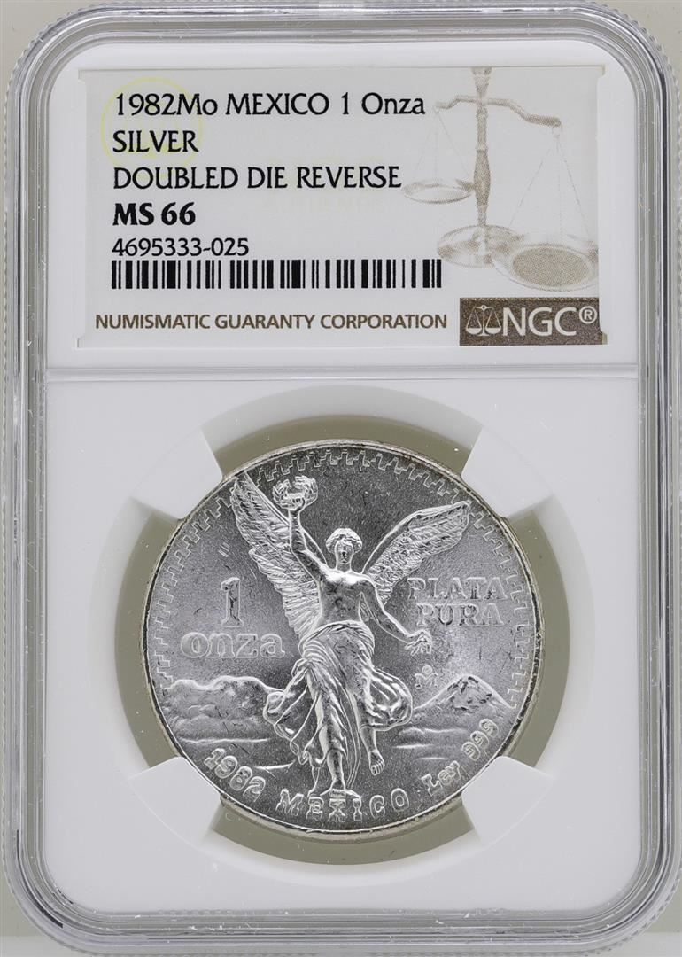 One 1982Mo Mexico Libertad Onza Doubled Die Reverse Silver Coin NGC MS66. NGC Certified.