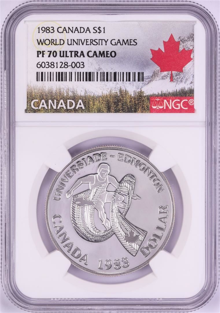 One 1983 $1 Proof Canada World University Games Silver Dollar Coin NGC PF70 Ultra Cameo. NGC Certified.