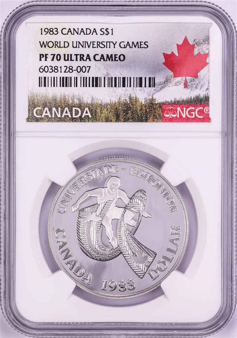 One 1983 $1 Proof Canada World University Games Silver Dollar Coin NGC PF70 Ultra Cameo. NGC Certified.