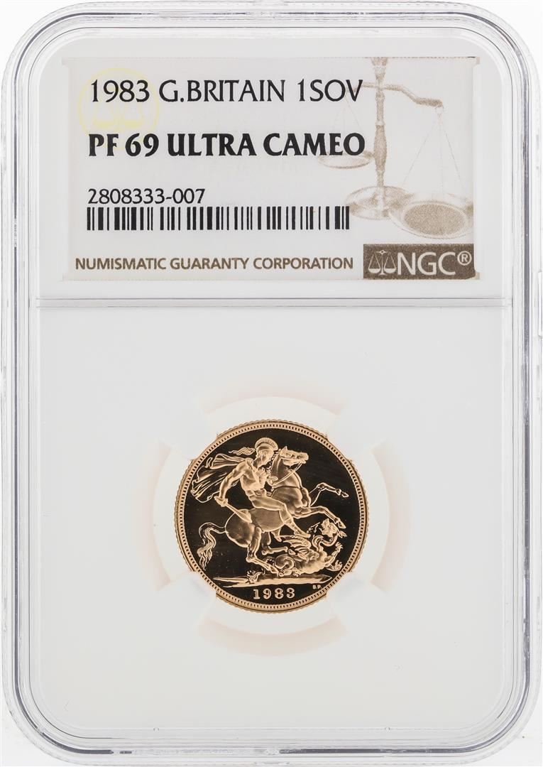 One 1983 Great Britain 1 Sovereign Gold Coin NGC PF69 Ultra Cameo. NGC Certified.