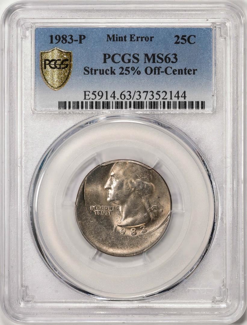 One 1983-P Washington Quarter Coin PCGS Mint Error Struck 25% Off-Center. PCGS Graded.