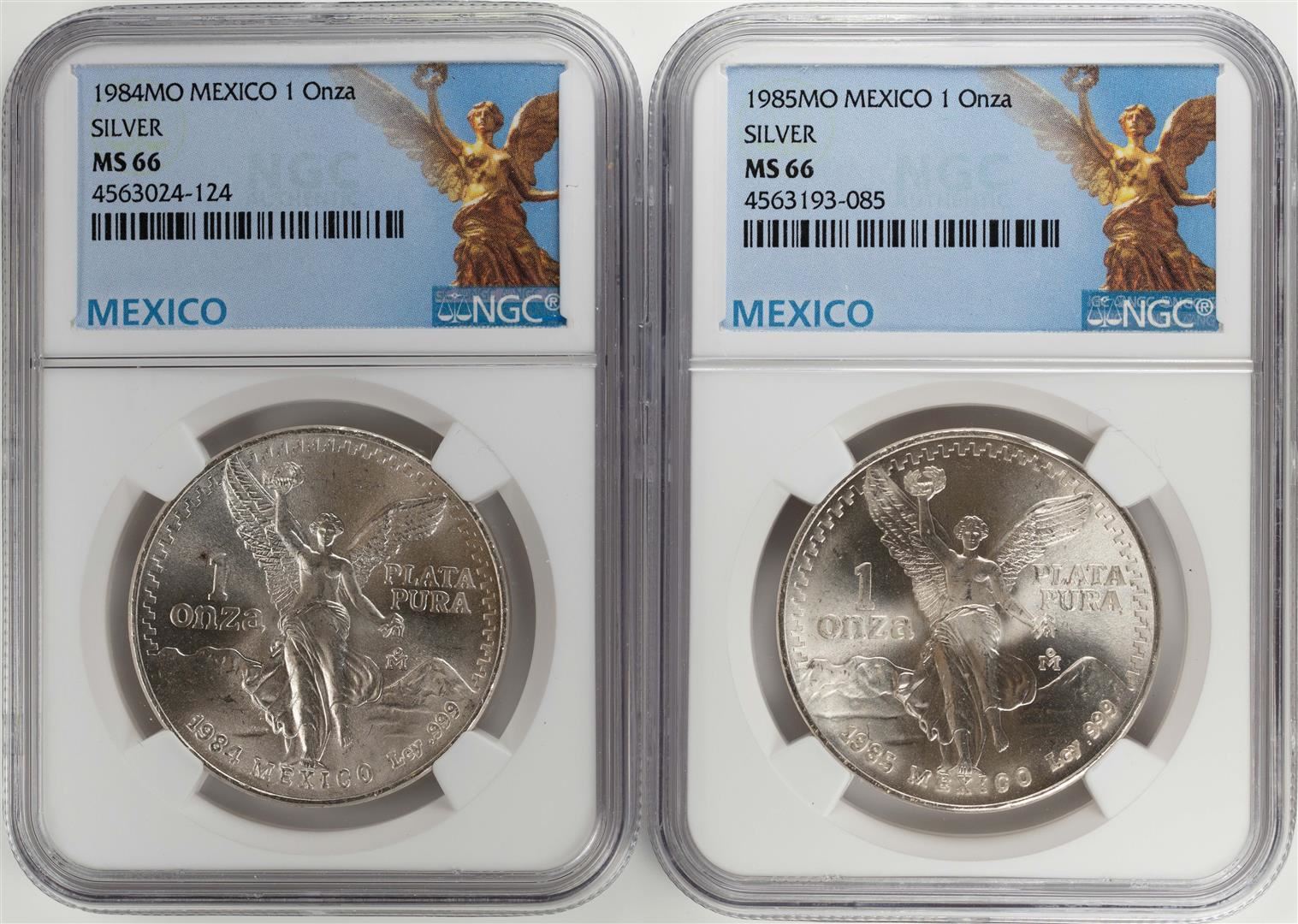 One 1984-1985Mo Mexico 1 Onza Libertad Silver Coins NGC MS66. NGC Certified.