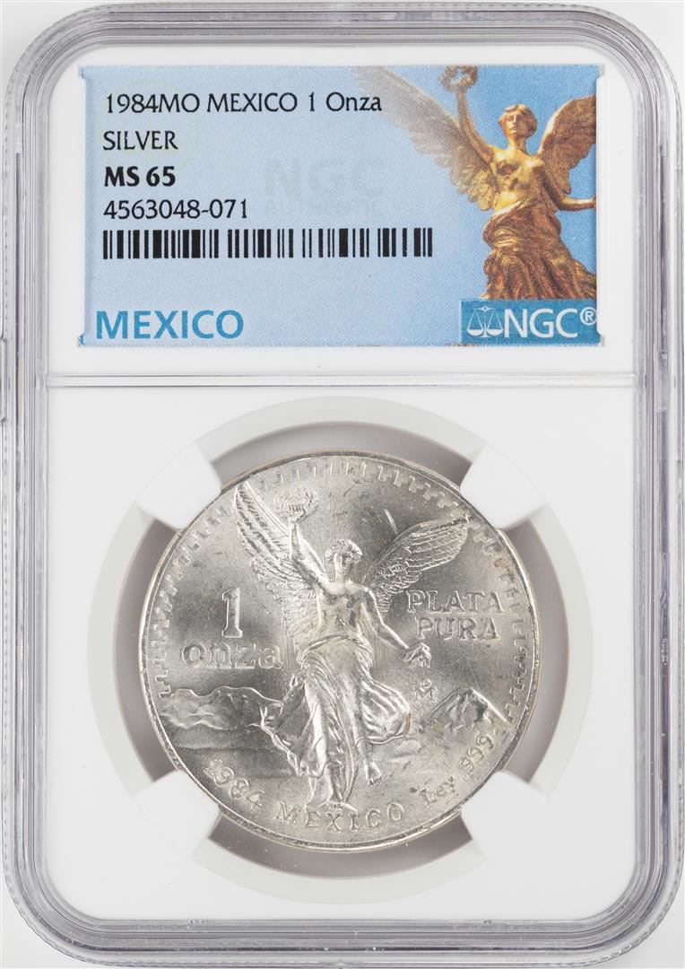 One 1984Mo Mexico 1 Onza Libertad Silver Coin NGC MS65. NGC Certified.