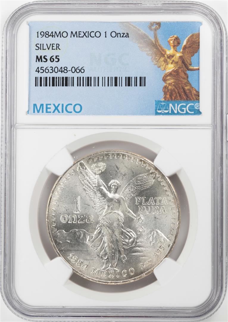 One 1984Mo Mexico 1 Onza Libertad Silver Coin NGC MS65. NGC Certified.