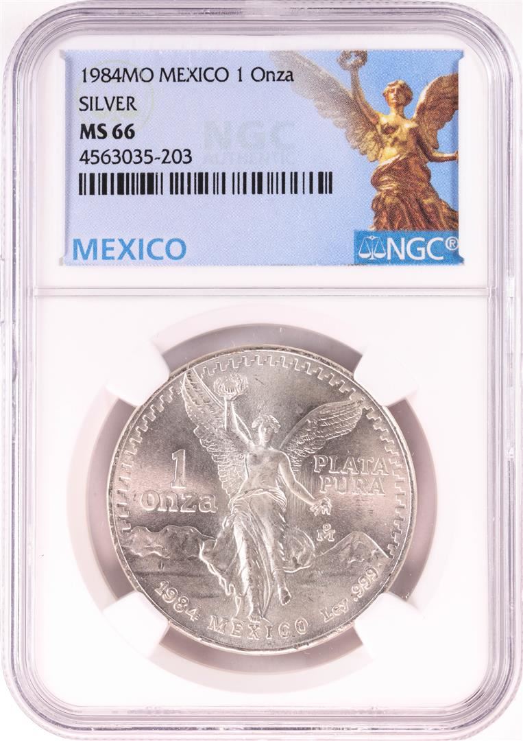 One 1984Mo Mexico 1 Onza Libertad Silver Coin NGC MS66. NGC Certified.