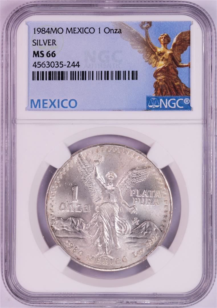 One 1984Mo Mexico 1 Onza Libertad Silver Coin NGC MS66. NGC Certified.
