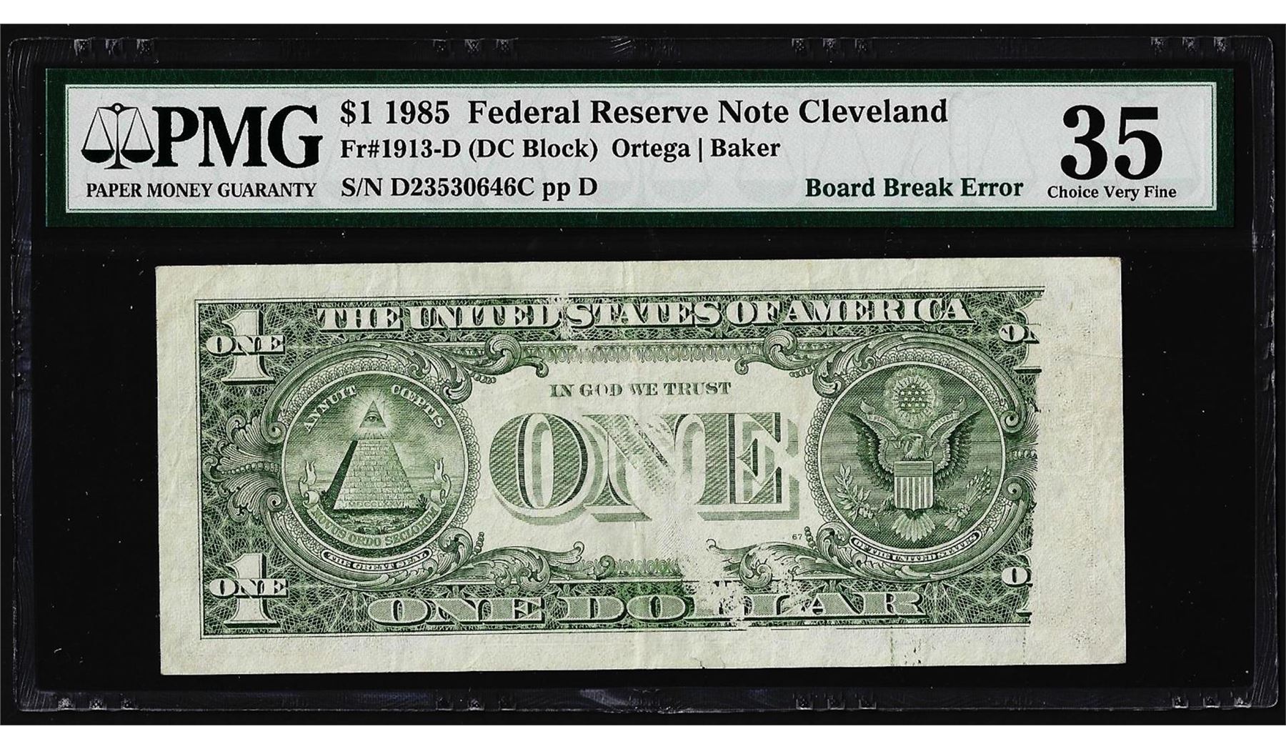 One 1985 $1 Federal Reserve Note Board Break ERROR PMG Choice Very Fine 35. PMG Certified.