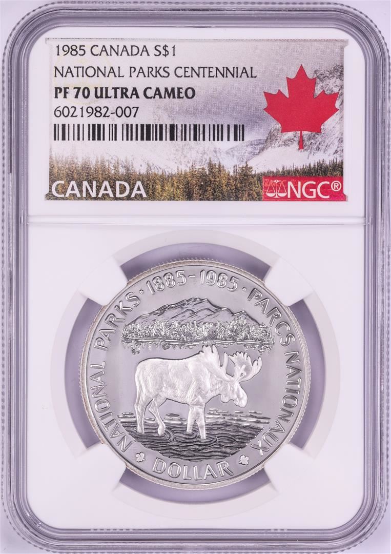 One 1985 $1 Proof Canada National Parks Centennial Silver Dollar Coin NGC PF70 Ultra Cameo. NGC Certified.