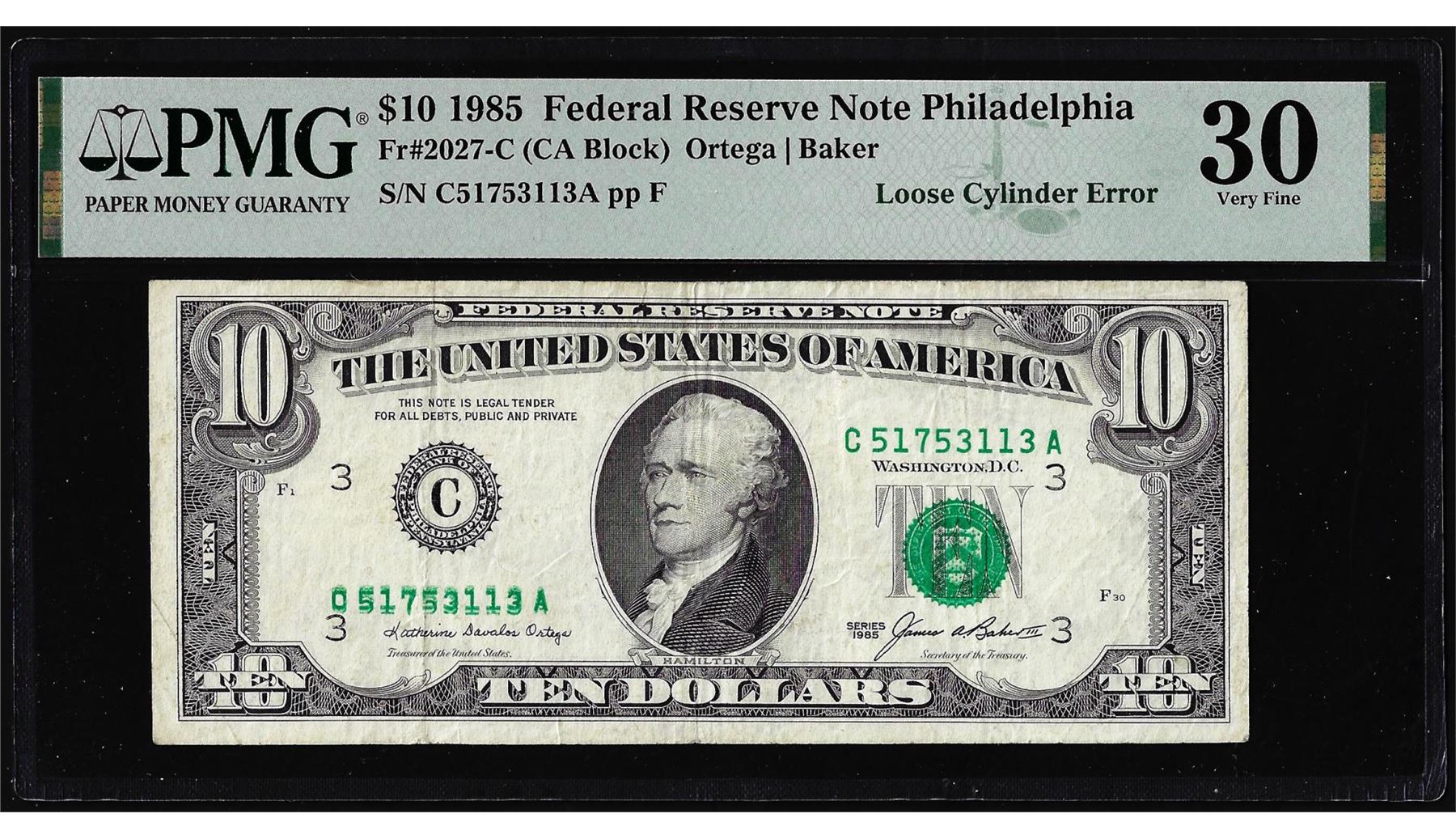One 1985 $10 Federal Reserve Note Loose Cylinder Error Fr.2027-C PMG Very Fine 30. PMG Certified.