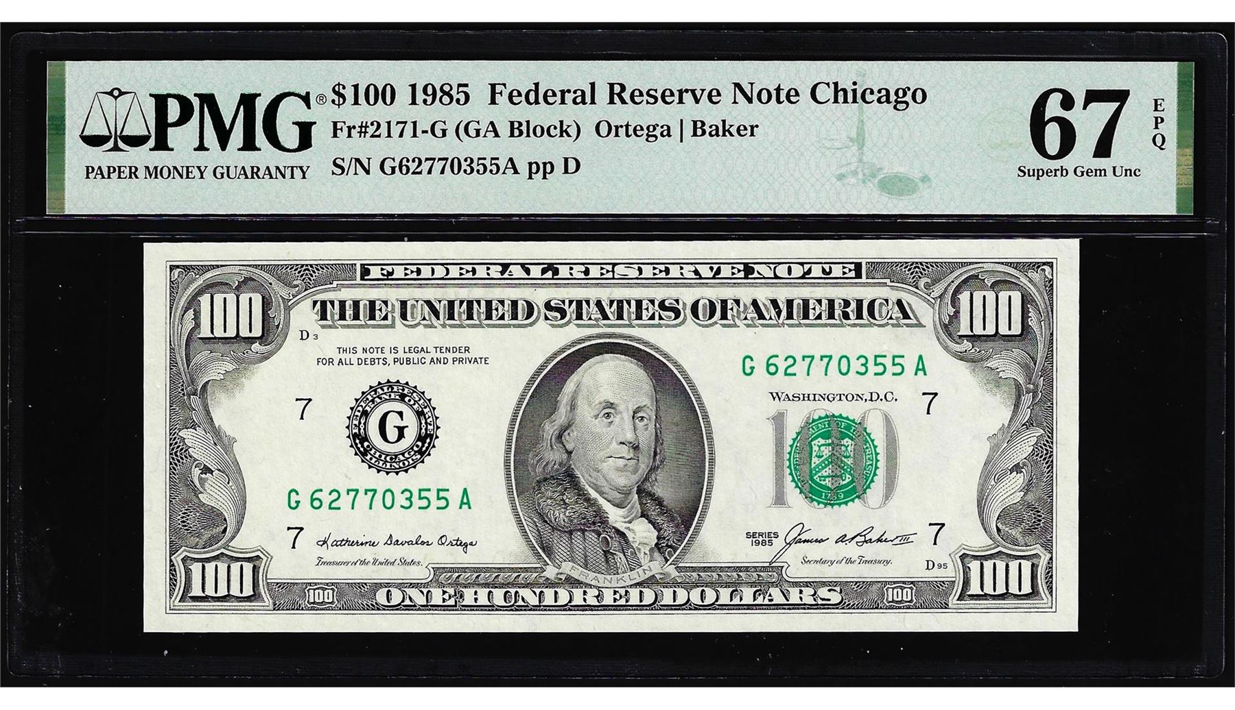 One 1985 $100 Federal Reserve Note Chicago Fr.2171-G PMG Gem Unc 67EPQ. PMG Certified.