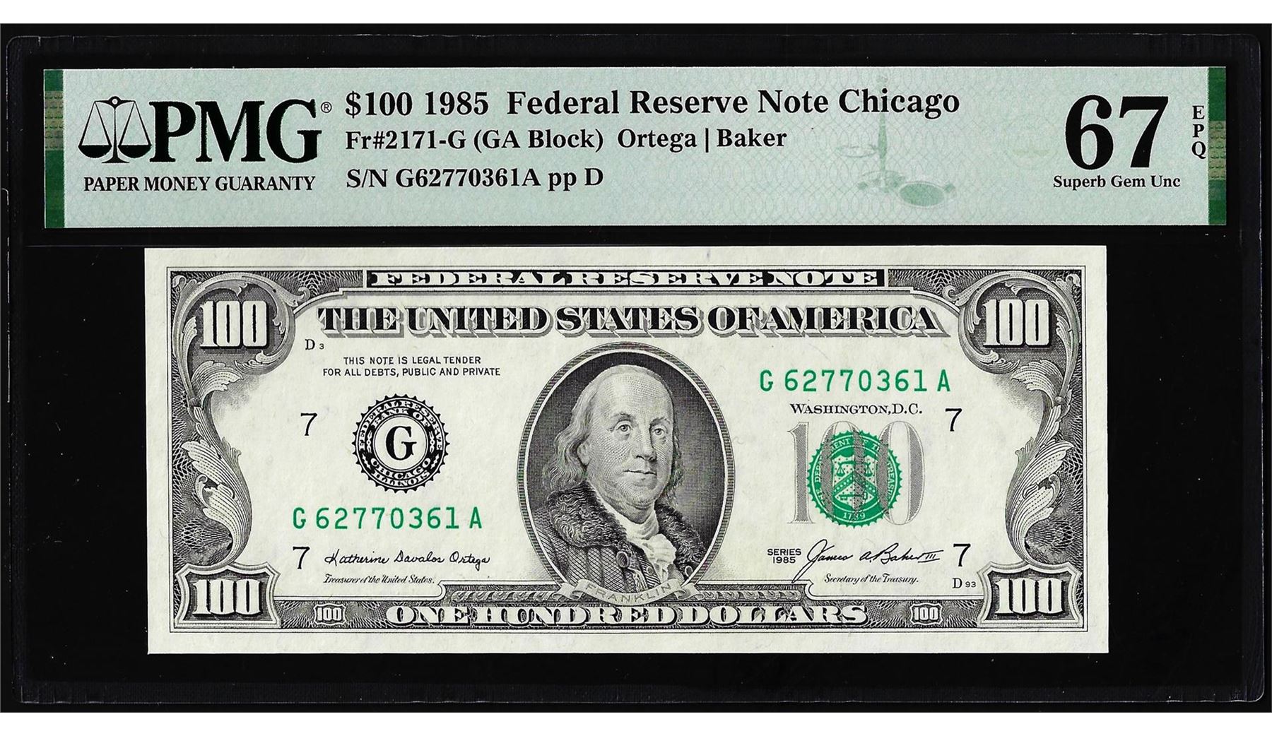 One 1985 $100 Federal Reserve Note Chicago Fr.2171-G PMG Gem Unc 67EPQ. PMG Certified.