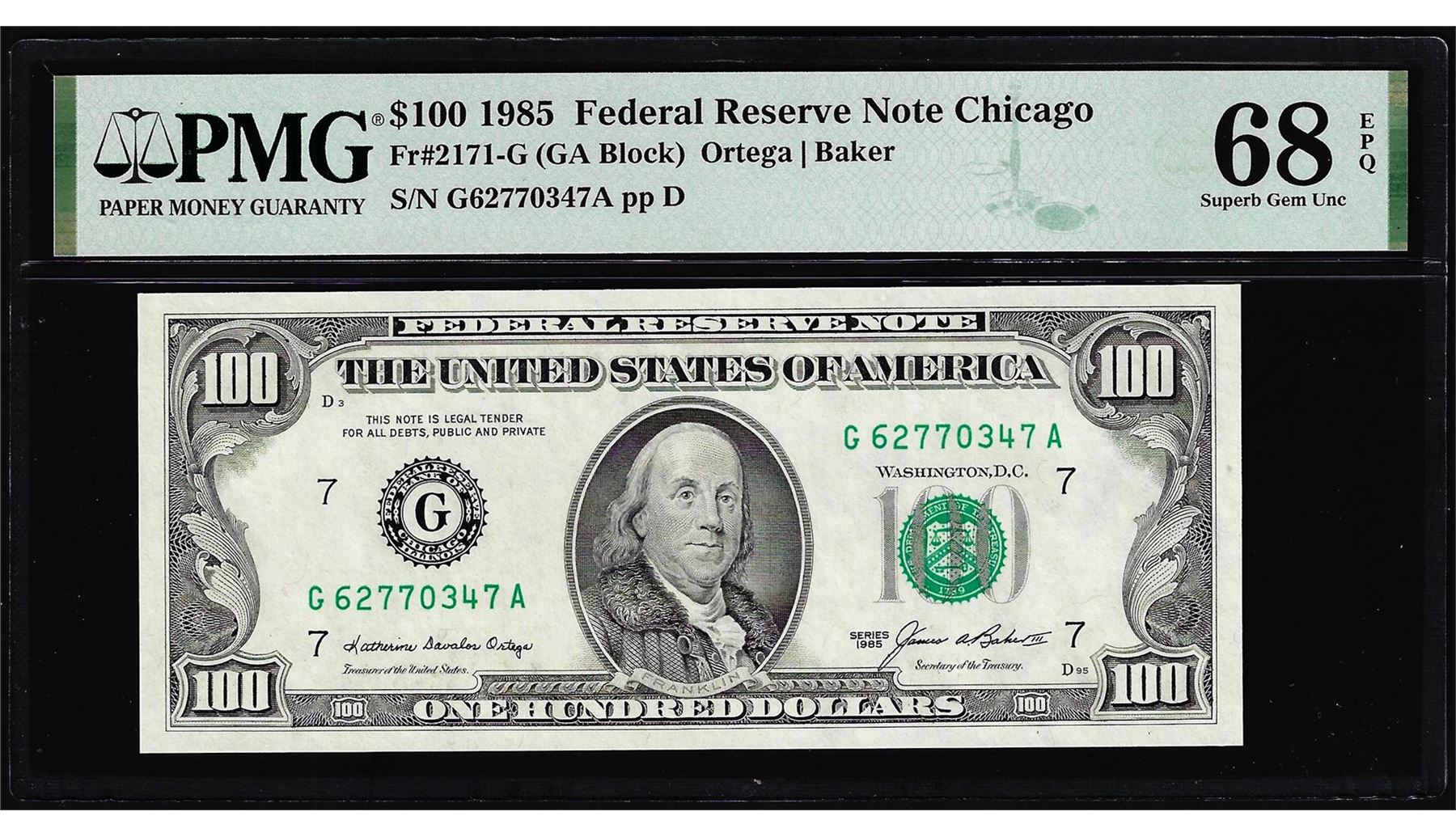 One 1985 $100 Federal Reserve Note Chicago Fr.2171-G PMG Superb Gem Uncirculated 68EPQ. PMG Certified.