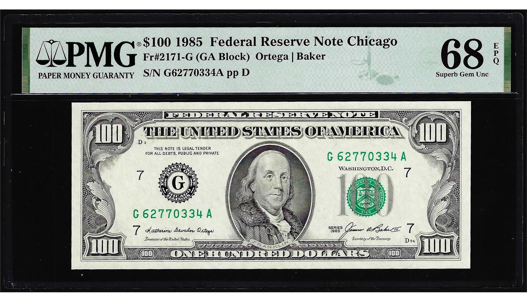 1985 $100 Federal Reserve Note Chicago Fr.2171-G PMG Superb Gem Uncirculated 68EPQ