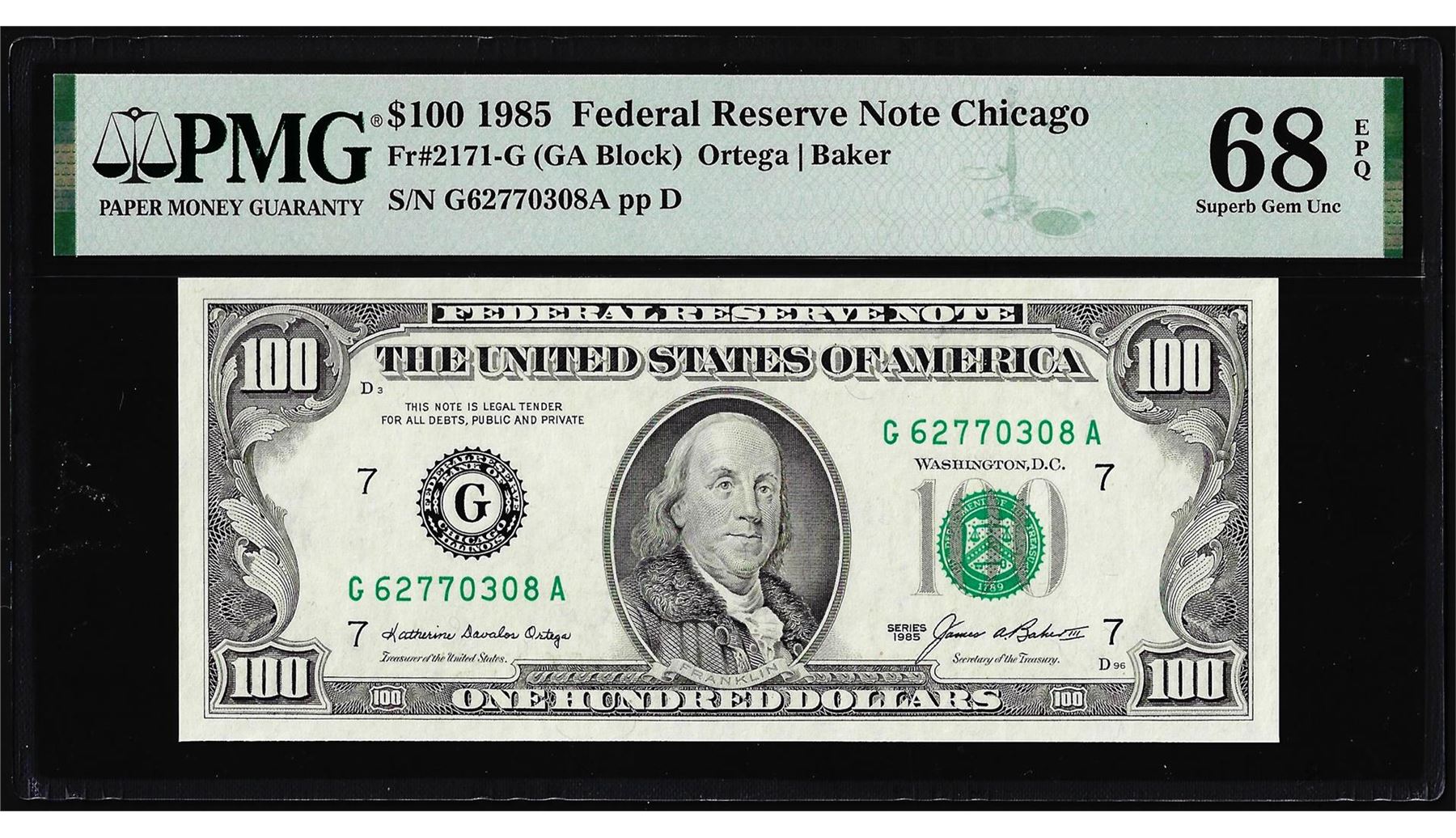 One 1985 $100 Federal Reserve Note Chicago Fr.2171-G PMG Superb Gem Uncirculated 68EPQ. PMG Certified.