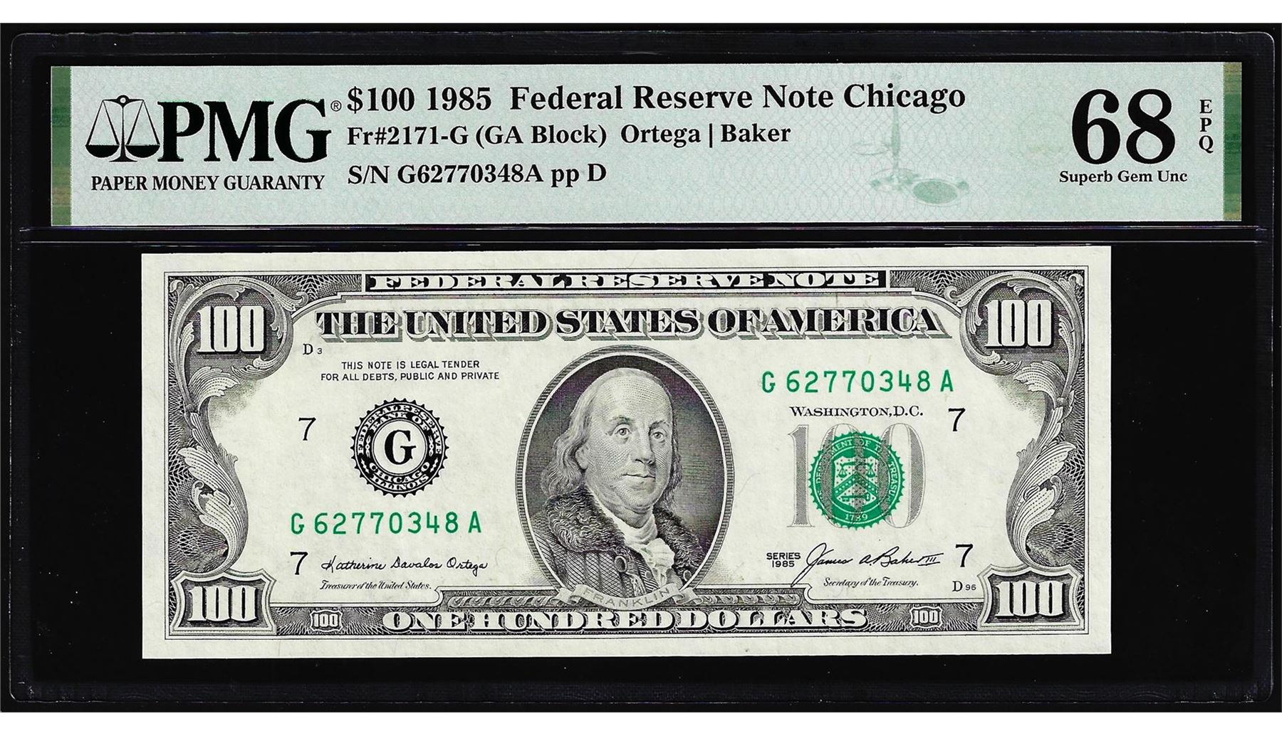 One 1985 $100 Federal Reserve Note Chicago Fr.2171-G PMG Superb Gem Uncirculated 68EPQ. PMG Certified.