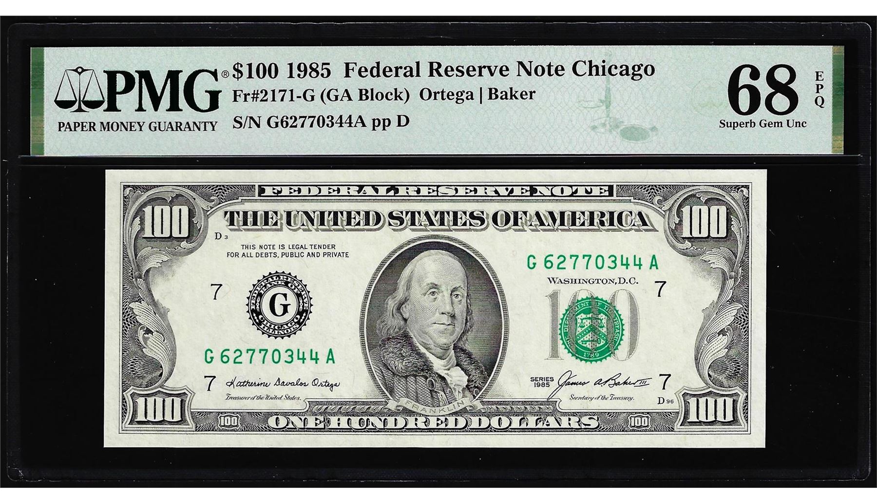 1985 $100 Federal Reserve Note Chicago Fr.2171-G PMG Superb Gem Uncirculated 68EPQ