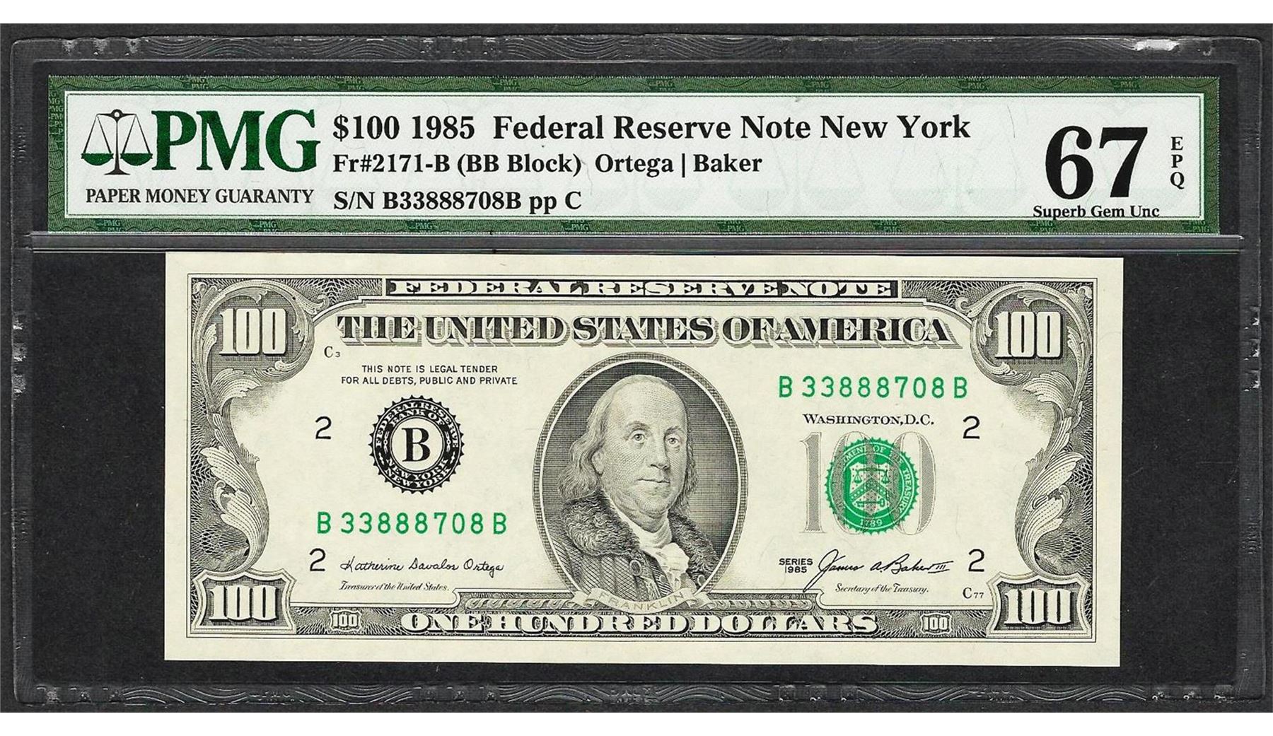 One 1985 $100 Federal Reserve Note New York Fr.2171-B PMG Superb Gem Unc 67EPQ. PMG Certified.