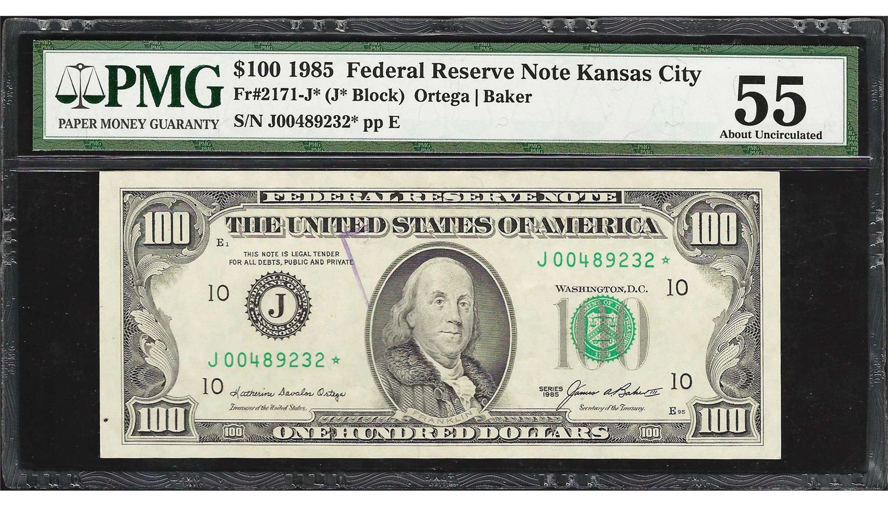 One 1985 $100 Federal Reserve STAR Note Fr.2171-J* PMG About Uncirculated 55. PMG Certified.