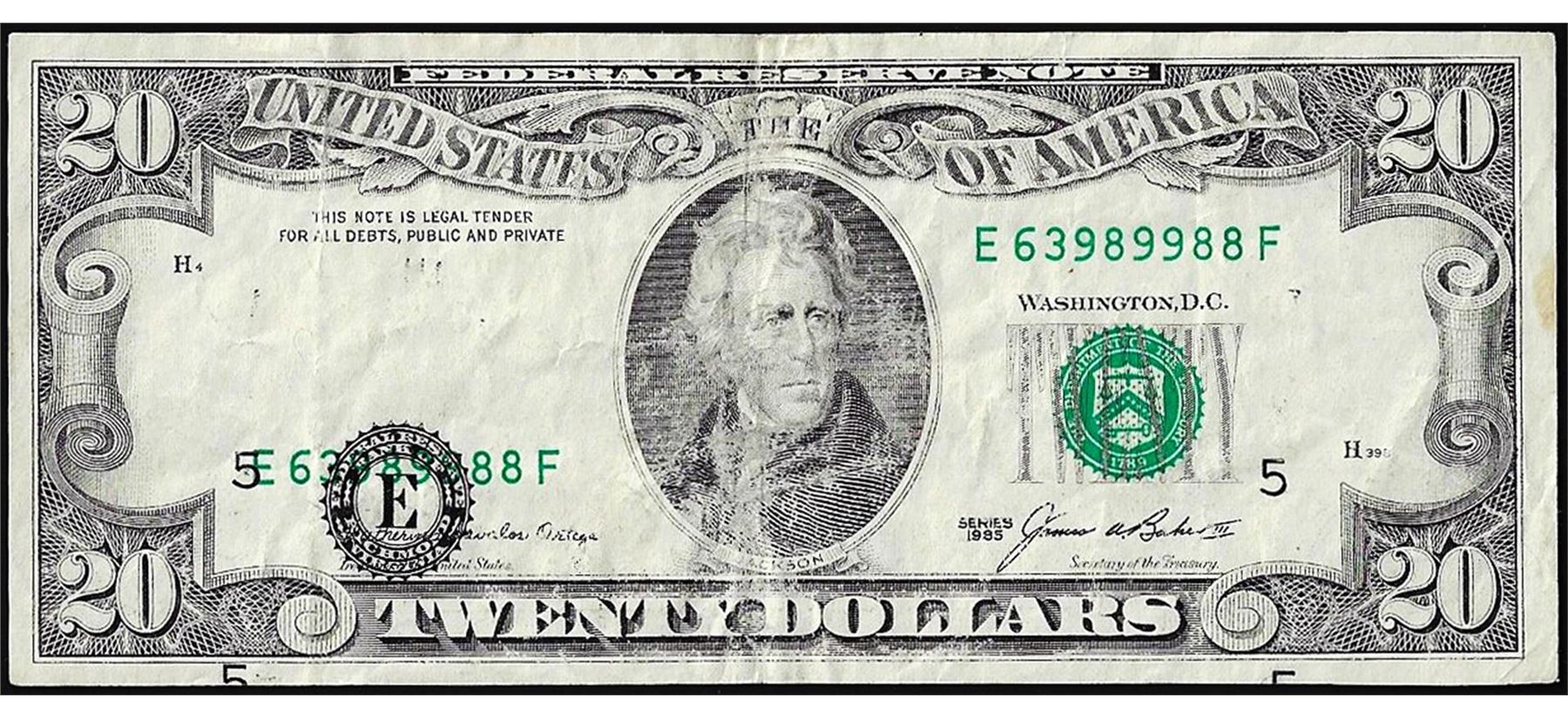 One 1985 $20 Federal Reserve Note Misaligned Overprint ERROR.