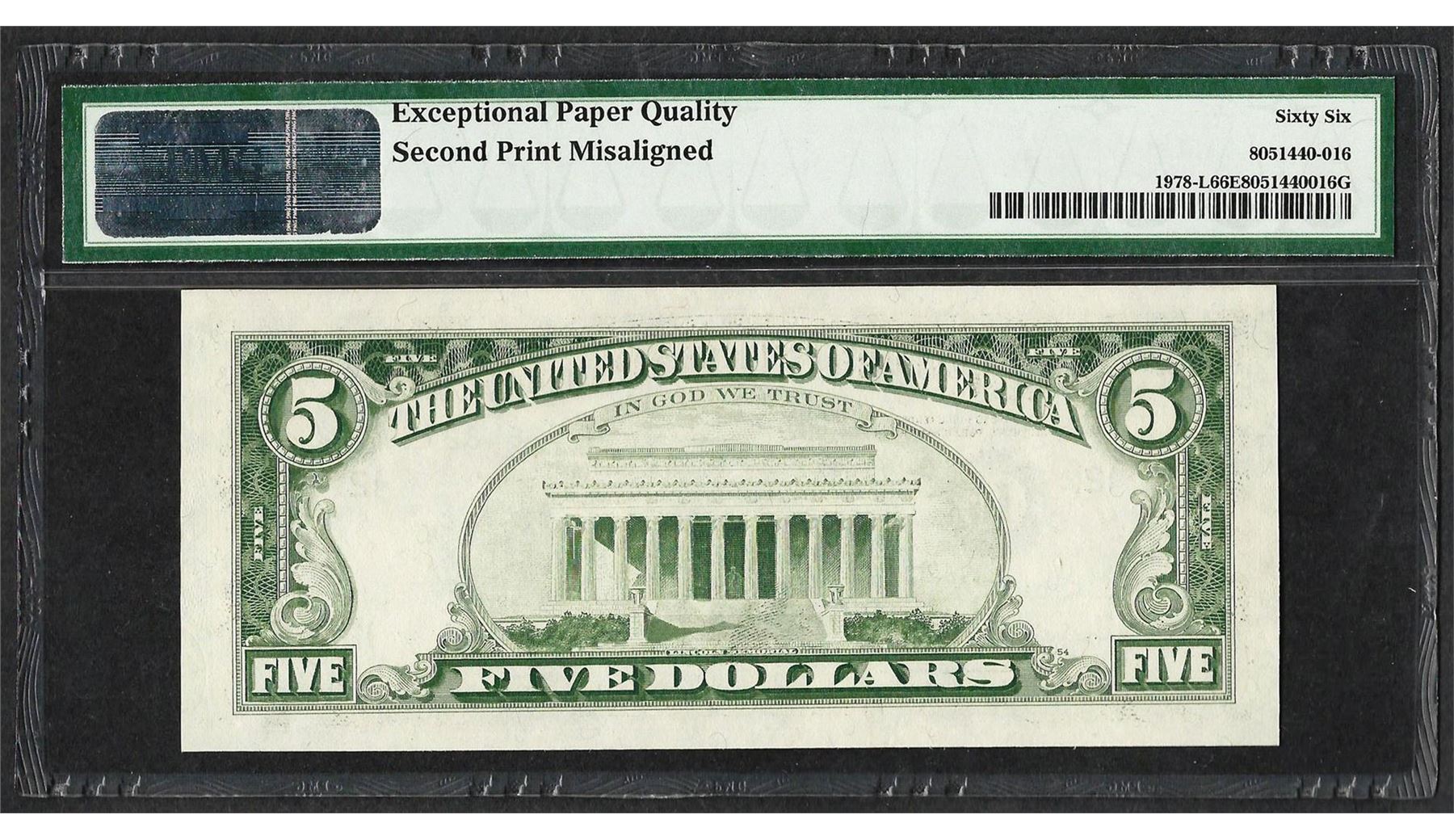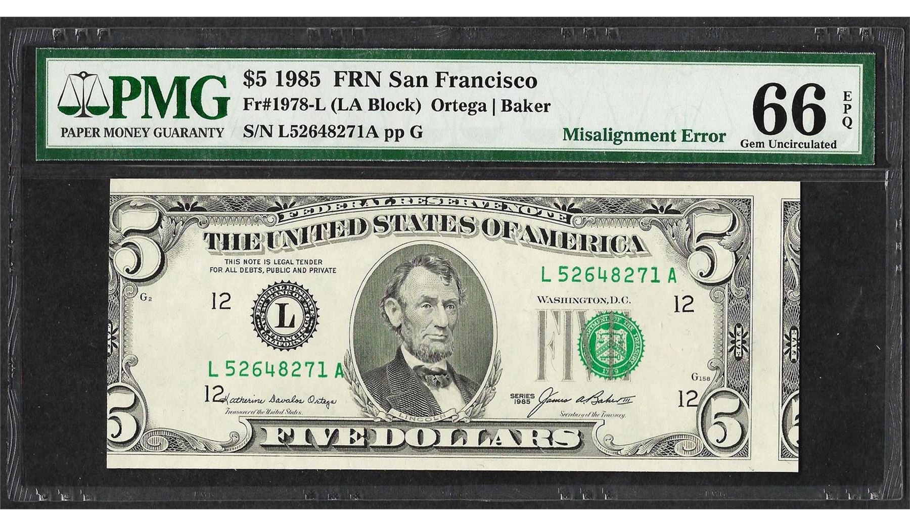 One 1985 $5 Federal Reserve Note ERROR Misalignment PMG Gem Uncirculated 66EPQ. PMG Certified.